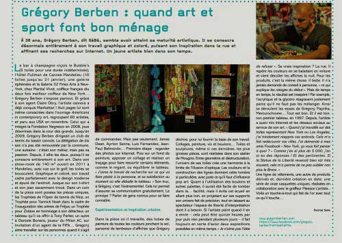 Deux univers auraient dû nous permettre de nous rencontrer plus tôt : le sport et la peinture, mais c’est en feuilletant les pages d’un magazine que je t’ai découvert. Quand le sport se fond avec l’art, ça donne ça. Un artiste accompli, qui OSE par ses mouvances, ses différentes matières, ses superpositions, ses couleurs. Un seul mot bravo  Je te souhaite le meilleur pour la suite de ta carrière, tu en as pris la bonne voie. A plus l’artiste !