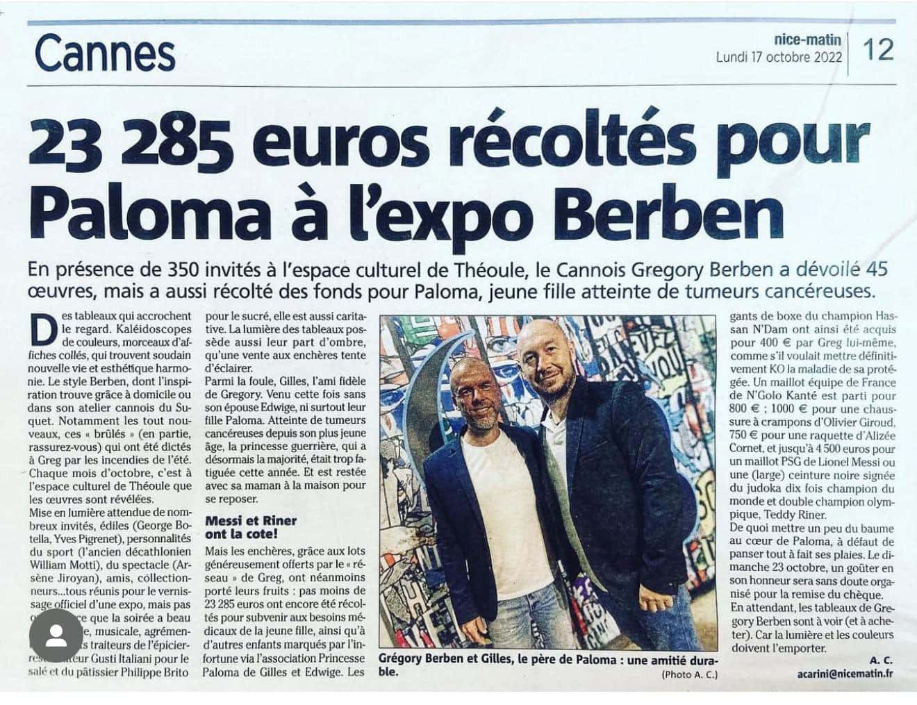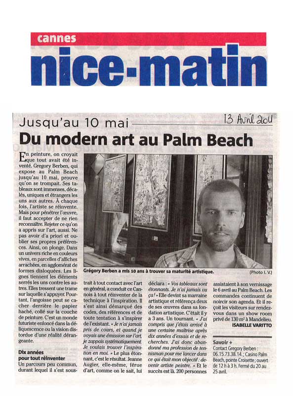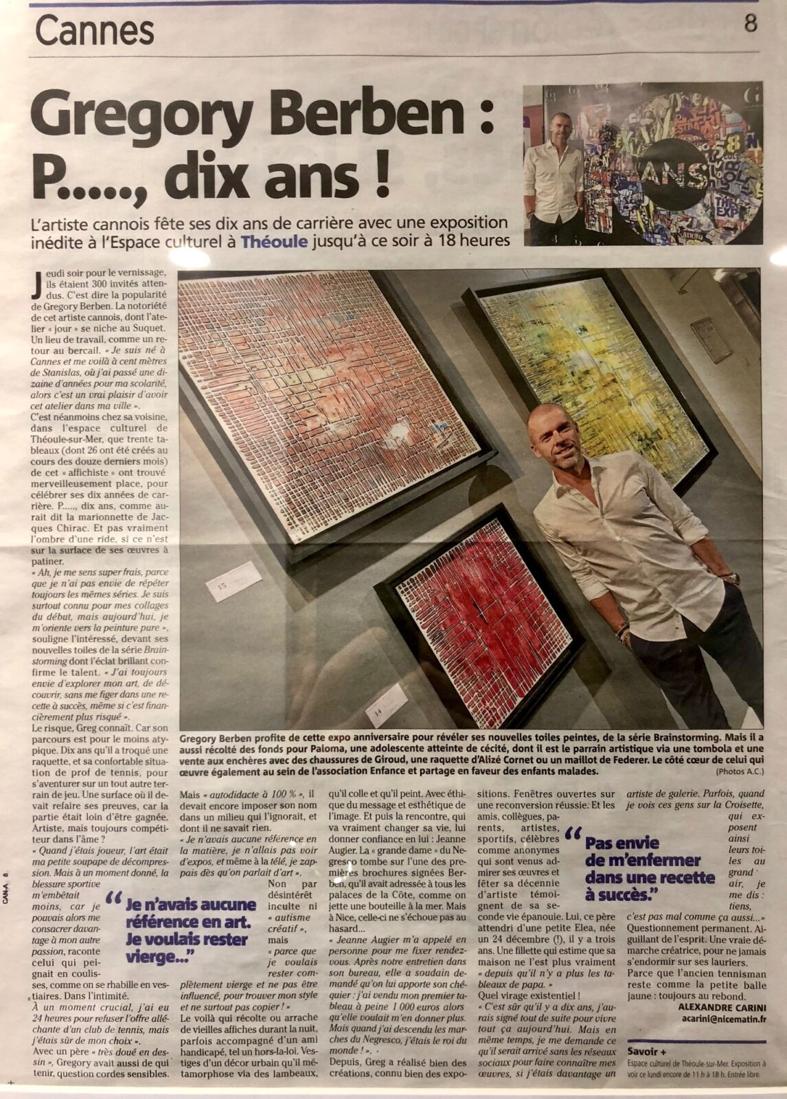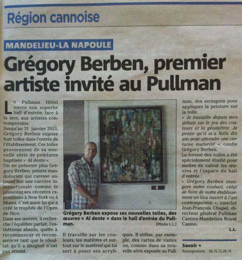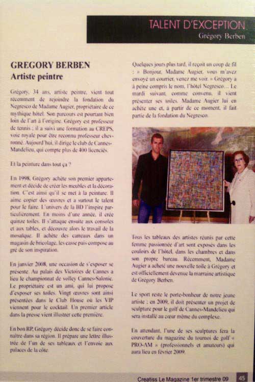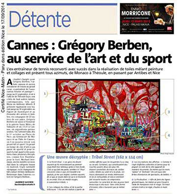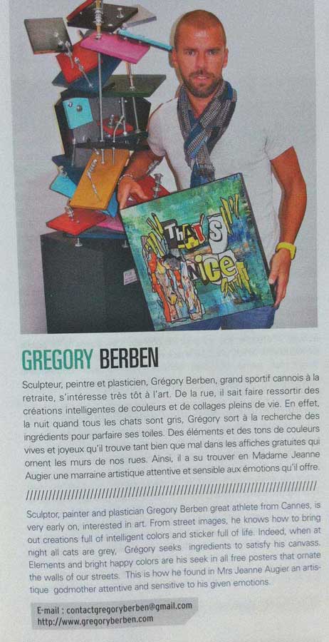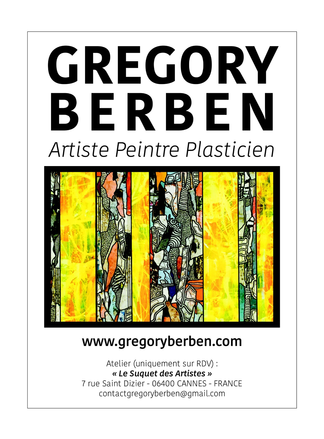 Partageant avec Gregory BERBEN une passion commune pour le sport, j’ai toujours apprécié son esprit conjuguant plasticité moderne et mouvement des couleurs. Artiste vif au contact de différentes matières, ses œuvres sont empreintes de cultures urbaines. Son univers fascinant, hérité du Pop’Art, mérite un écho et un suivi que je recommande à tous les Cannois, amoureux de peintures singulières aux contrastes saisissants.