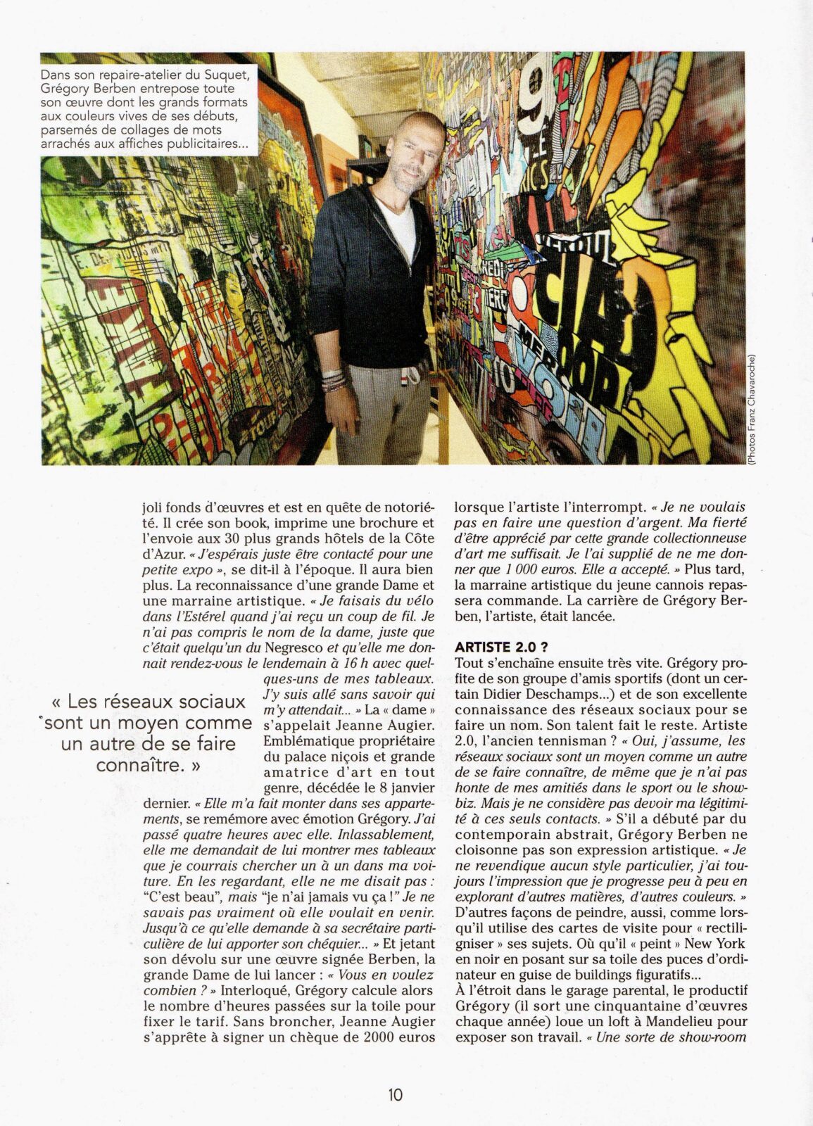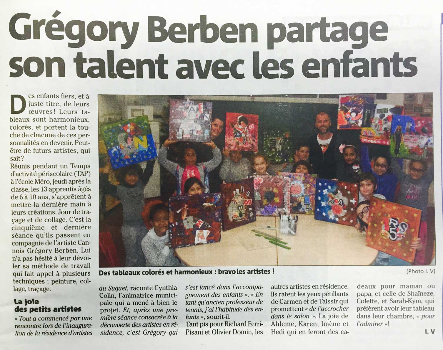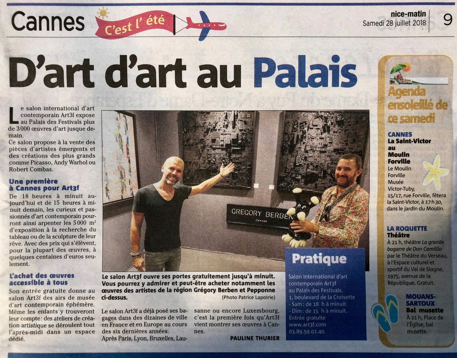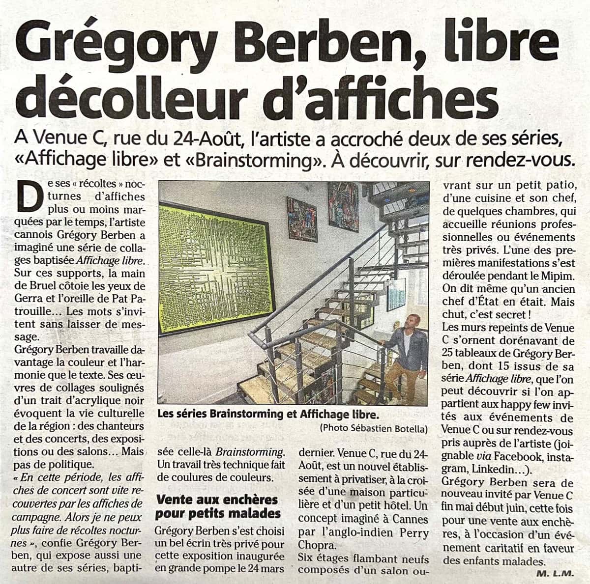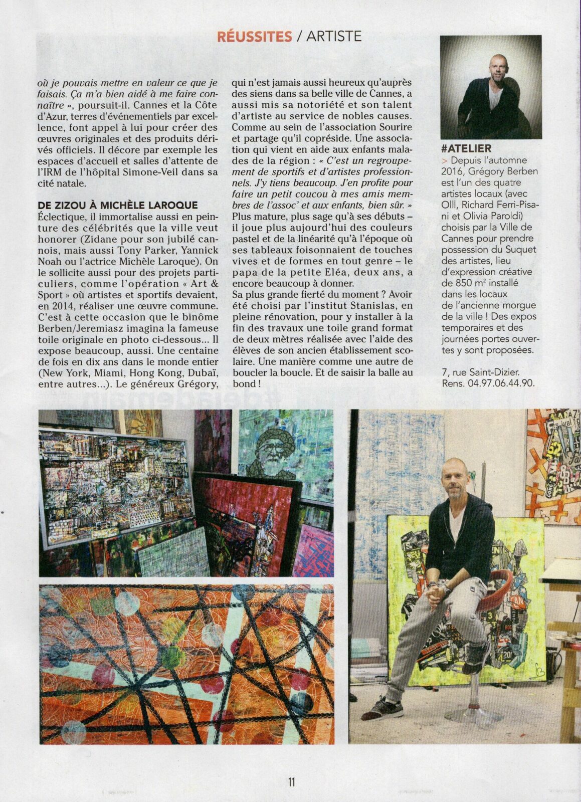 Partageant avec Gregory BERBEN une passion commune pour le sport, j’ai toujours apprécié son esprit conjuguant plasticité moderne et mouvement des couleurs. Artiste vif au contact de différentes matières, ses œuvres sont empreintes de cultures urbaines. Son univers fascinant, hérité du Pop’Art, mérite un écho et un suivi que je recommande à tous les Cannois, amoureux de peintures singulières aux contrastes saisissants.