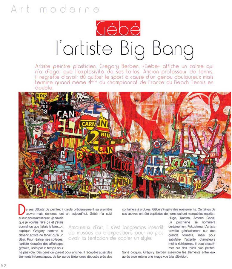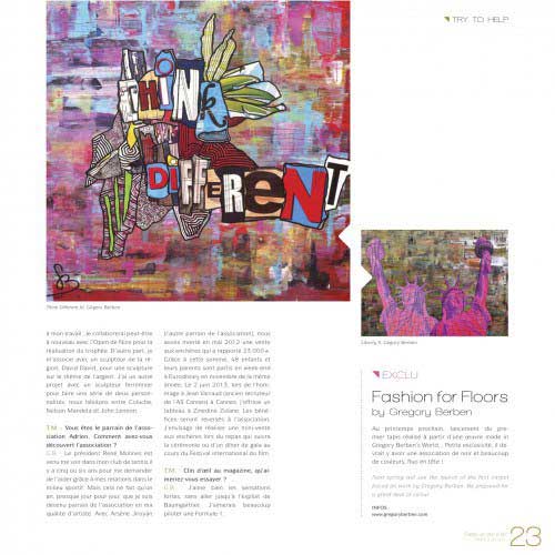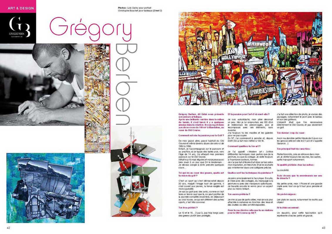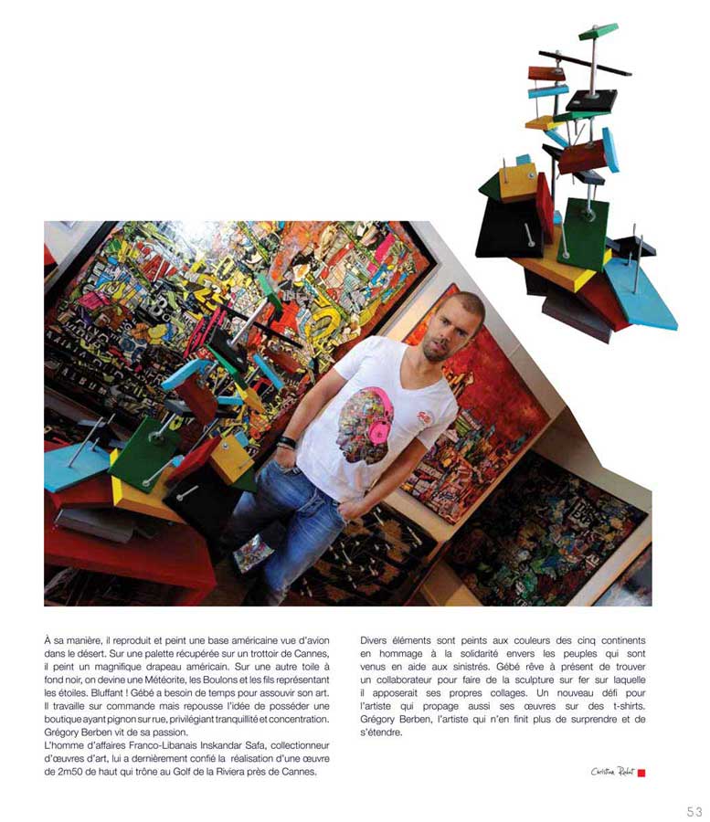 Technique mixte, effets graphiques et fragmentés, jeux de rayures, découpes asymétriques, les tableaux de Grégory Berben illustrent la quintessence du style « GB ». A chaque assemblage, sa note arty, sa construction extrêmement recherchée, sa touche pop… Une allure plurielle, composée selon les pulsions du peintre plasticien, déclinée en compositions all over. Des réalisations à forte identité qui revendiquent la différence et ne s’inscrivent dans aucune tendance. Bravo l’artiste !