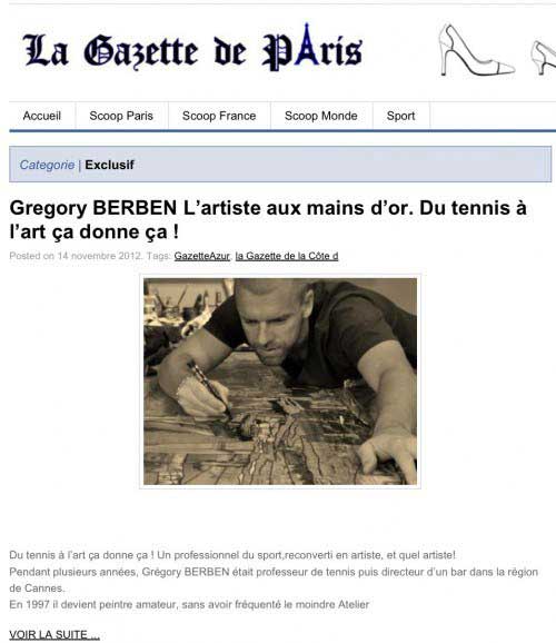 Gregory Berben : ‘Le Talent à l’état pur’. L’homme est simple et charismatique … au même titre que ses créations.  Le talent est reconnaissable lorsque la simplicité est induite dans la création de son ART, et bien sûr lorsque l’on est attentif: l’émotion est au rendez-vous. C’est: ‘l’art perfection’ de Gregory Berben.
