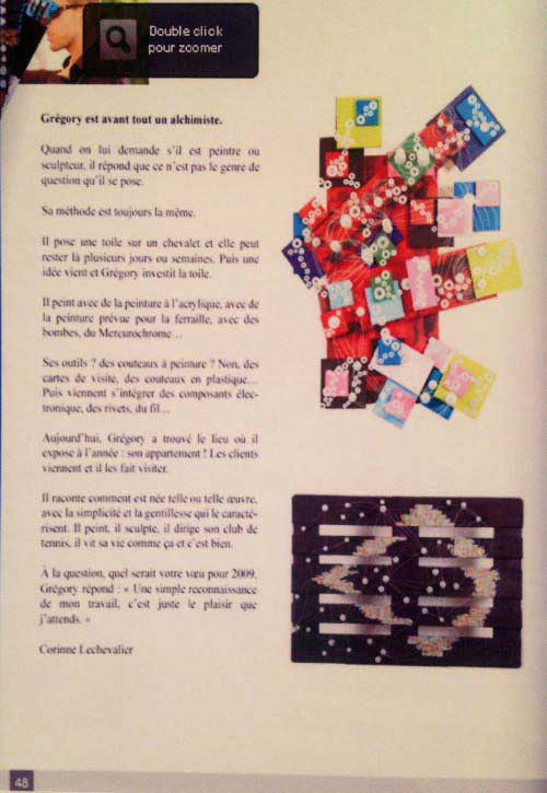 Je trouve les tableaux de Greg très originaux. Le mélange des collages, des montages et surtout des couleurs donnent à cet art contemporain quelque chose d’unique et d’intrigant. C’est une bouffée d’énergie comme l’artiste !