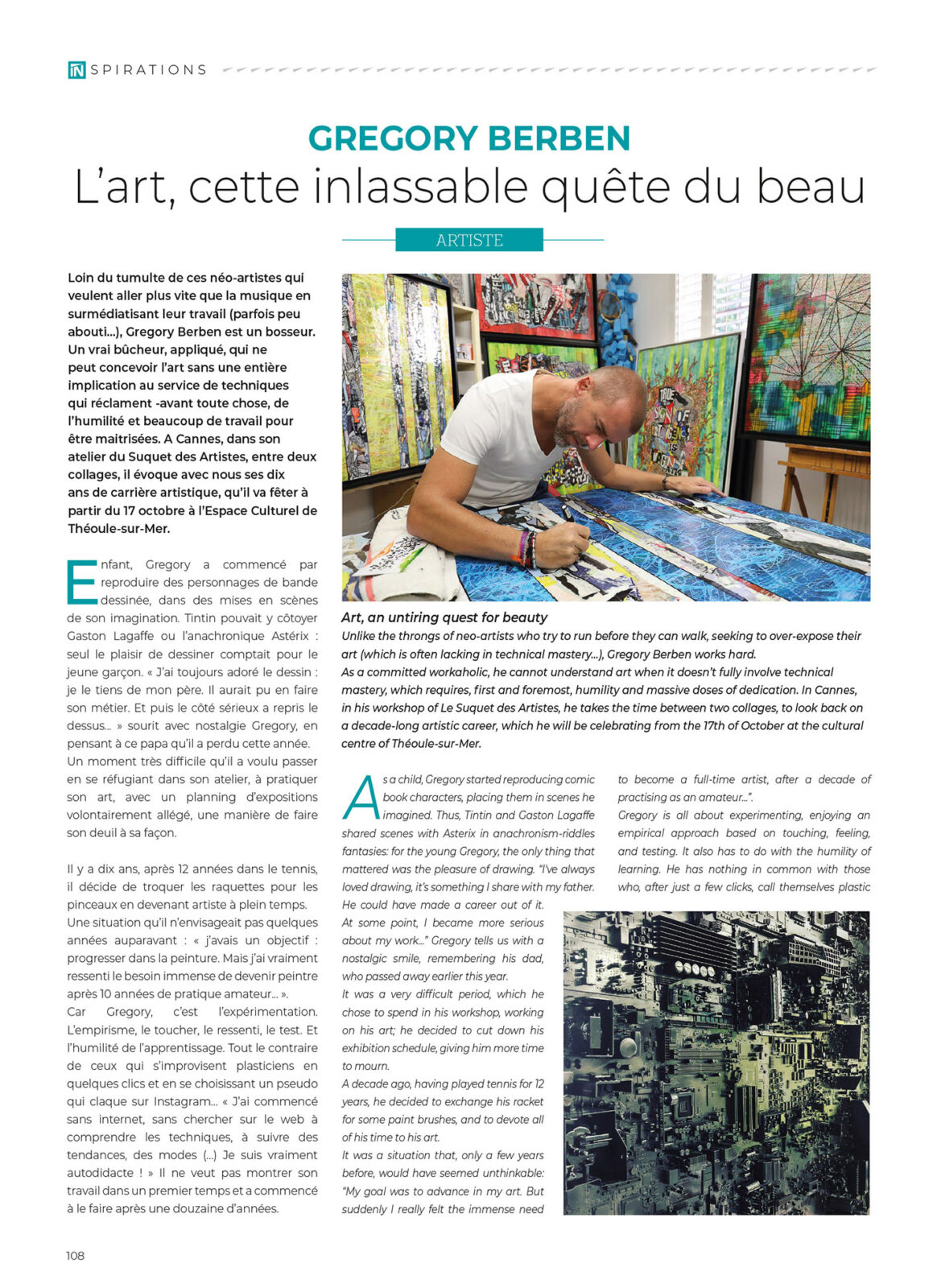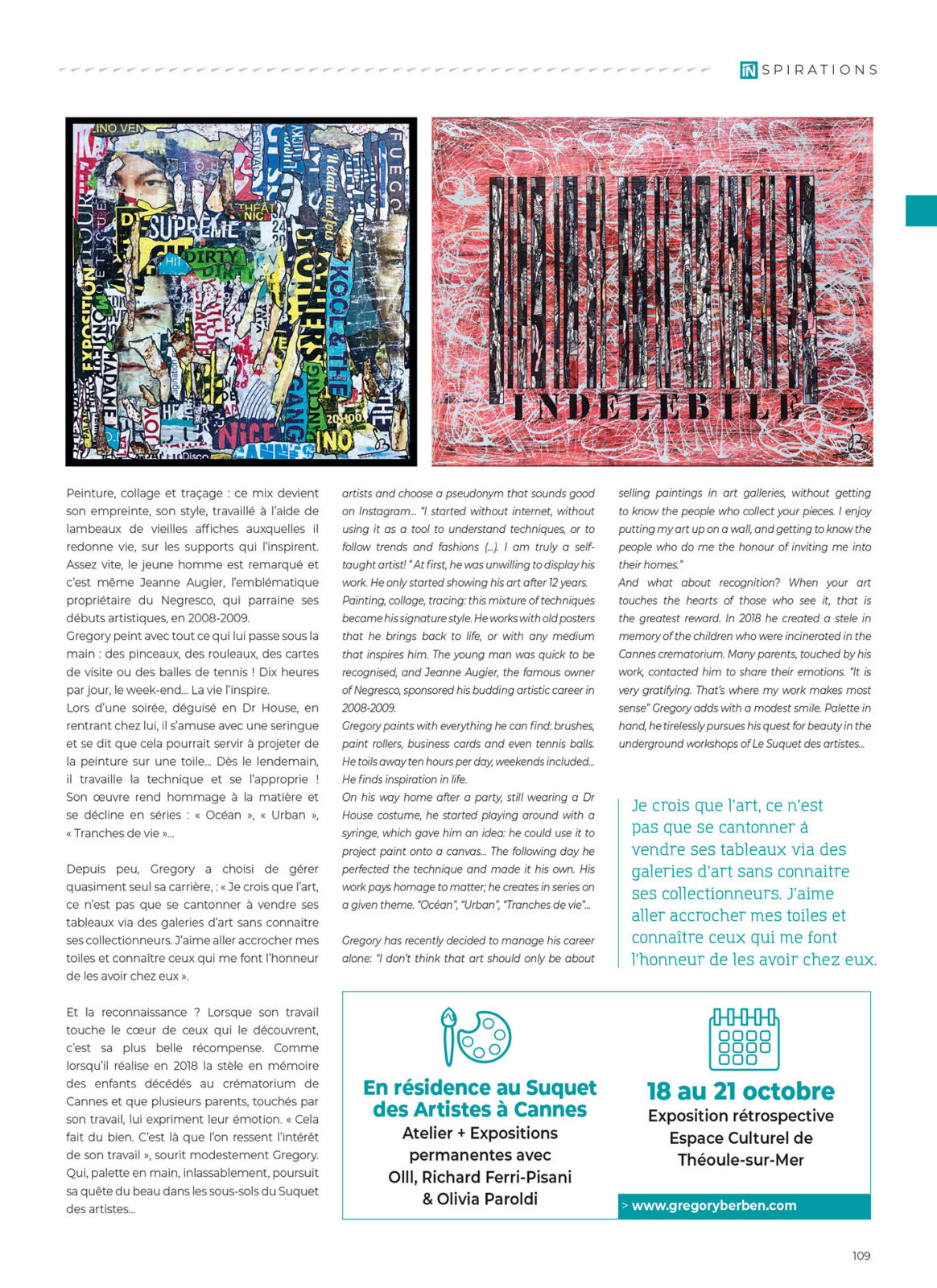 Gregory BERBEN est un artiste pour le moins singulier avec un parcours atypique ! Inspiré un peu malgré lui par l’univers de la BD et du Pop Art, il laisse libre cours à son imagination très personnelle ou transparait une énergie indéniable et un réel talent…Madame Augier, propriétaire du Negresco qui est devenue sa marraine artistique l’a plébiscité, c’est dire !!! GB, un parcours sans faute…à suivre de très près…