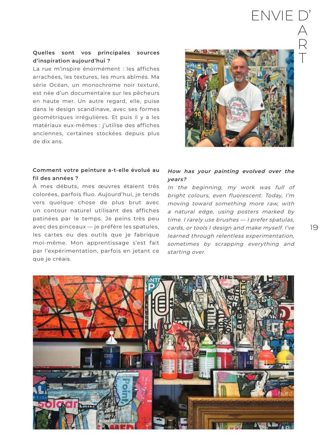 C’est avec un particularisme et un modernisme unique que tu transportes chaque admirateur de tes oeuvres dans un univers urbain et chaud en couleurs entremêlé de collages, parfois sur fond de street-art. Continues de faire voyager ton public au travers de tes inspirations…
